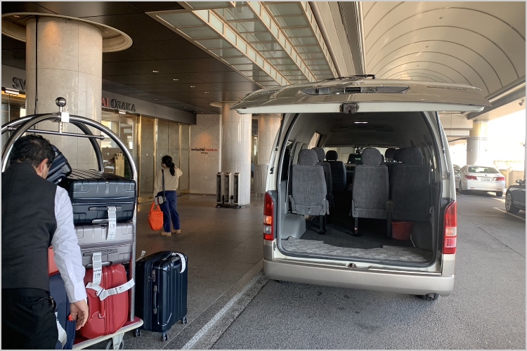 Once your luggage is loaded, the driver will depart for Kansai Airport. The approximate travel time from hotels in each city to Kansai Airport is as follows: